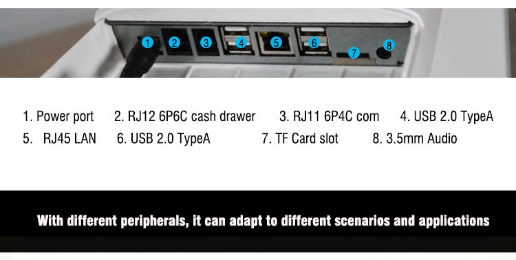 Ports | 1* SIM Card slot(optional) 1* RJ12 6P6C cash drawer |